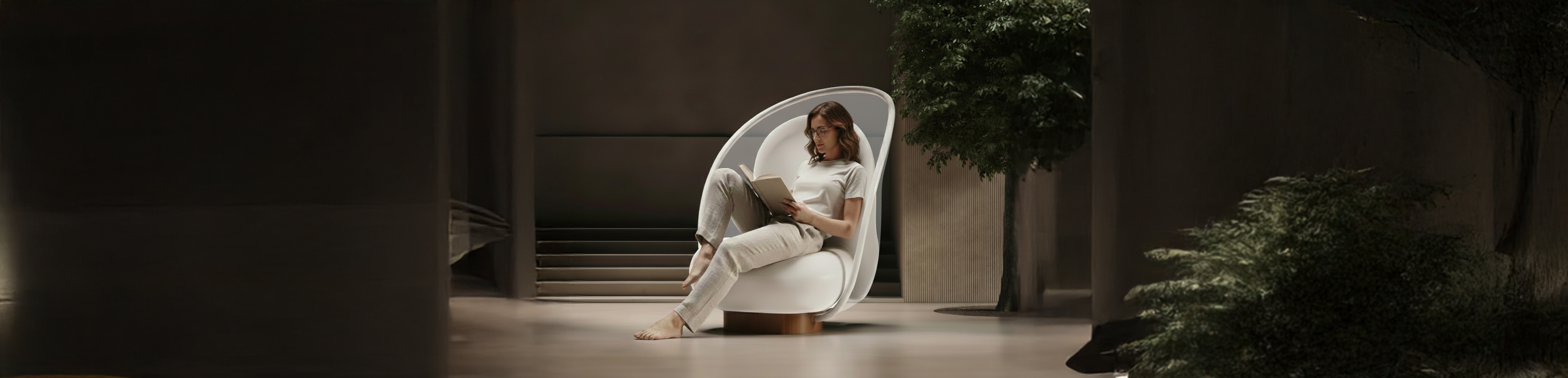 A sculptural lounge chair exploring organic forms through the lens of minimal dreamscape—snug fit, cozy ethereal, and flowing silhouettes.